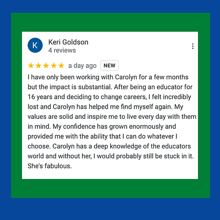 “Carolyn's warm and encouraging approach made me feel so comfortable sharing my struggles and obstacles. She helped me see clarity around prioritizing projects and work for the year ahead. Overwhelm is a big problem for me in the work I'm doing and having an ear and a guide to coach you through all of the stuff is really an asset.
