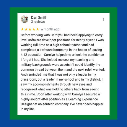 This was a deeply impactful session, and I would recommend Carolyn to anyone who’s actually ready to take their careers into their own hands and make meaningful change."